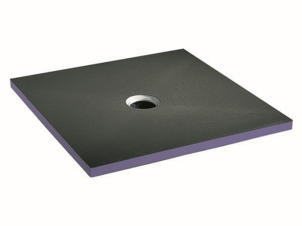 wasserdichtes Duschelement zur direkten bodengleichen Verfliesung, Kern aus extrudiertem Polystyrol-Hartschaum, beidseitig mit Glasfasergewebe armiert, mit kunststoffvergütetem Mörtel beschichtet und abgesandet
