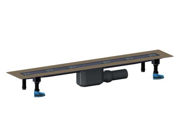 Bauhöhe 110 mm, nach DIN EN 1253, für die Montage in der Fläche, mit einem Ablaufgehäuse, Ablaufstutzen DN 50 seitlich, mit Kugelgelenk verstellbar von 0–15°, schallentkoppelnde Montagefüße zur Höheneinstellung, besandeter Flansch zum sicheren Anschluss an Verbundabdichtungen gemäß DIN 18534, herausnehmbarer Geruchs- und Reinigungsverschluss, Sperrwasserhöhe 50 mm (gem. DIN EN 1253), höhenverstellbare Justierschrauben, Bauschutz, Fliesenanschlag, Rahmenklemmstück, Rinnenkörper Edelstahl 1.4301, Ablaufkörper Polypropylen, hochschlagfest