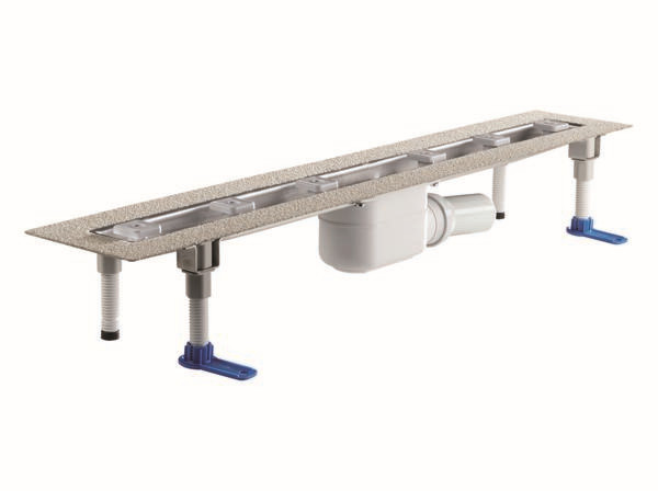 Bauhöhe 110 mm, nach DIN EN 1253, für die Montage in der Fläche, mit einem Ablaufgehäuse, Ablaufstutzen DN 50 seitlich, mit Kugelgelenk verstellbar von 0–15°, schallentkoppelnde Montagefüße zur Höheneinstellung, besandeter Flansch zum sicheren Anschluss an Verbundabdichtungen gemäß DIN 18534, herausnehmbarer Geruchs- und Reinigungsverschluss, Sperrwasserhöhe 50 mm (gem. DIN EN 1253), höhenverstellbare Justierschrauben, Bauschutz, Fliesenanschlag, Rahmenklemmstück, Rinnenkörper Edelstahl 1.4301, Ablaufkörper Polypropylen, hochschlagfest