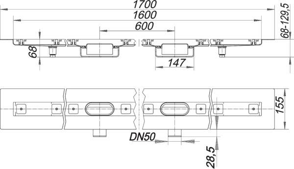Bauhöhe 68 mm, für die Montage in der Fläche, mit zwei Ablaufgehäusen, Ablaufstutzen DN 50 horizontal, schallentkoppelnde Montagefüße zur Höheneinstellung, besandeter Flansch zum sicheren Anschluss an Verbundabdichtungen gem DIN 18534, herausnehmbarer Geruchs- und Reinigungsverschluss, Sperrwasserhöhe 24 mm (abweichend von DIN EN 1253), höhenverstellbare Justierschrauben, Bauschutz, Fliesenanschlag, Rahmenklemmstück, Rinnenkörper Edelstahl 1.4301, Ablaufkörper Polypropylen, hochschlagfest