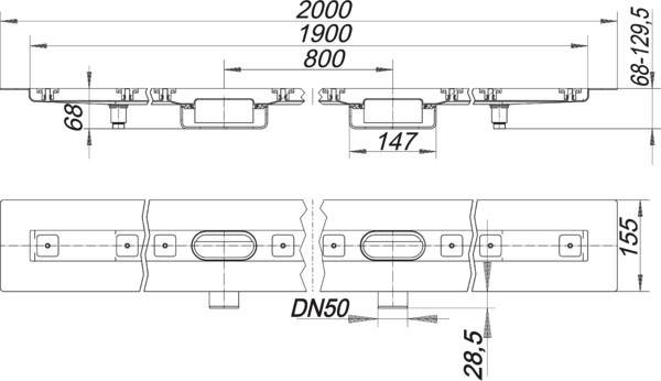 Bauhöhe 68 mm, für die Montage in der Fläche, mit zwei Ablaufgehäusen, Ablaufstutzen DN 50 horizontal, schallentkoppelnde Montagefüße zur Höheneinstellung, besandeter Flansch zum sicheren Anschluss an Verbundabdichtungen gem DIN 18534, herausnehmbarer Geruchs- und Reinigungsverschluss, Sperrwasserhöhe 24 mm (abweichend von DIN EN 1253), höhenverstellbare Justierschrauben, Bauschutz, Fliesenanschlag, Rahmenklemmstück, Rinnenkörper Edelstahl 1.4301, Ablaufkörper Polypropylen, hochschlagfest