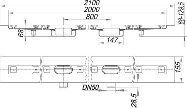 Bauhöhe 68 mm, für die Montage in der Fläche, mit zwei Ablaufgehäusen, Ablaufstutzen DN 50 horizontal, schallentkoppelnde Montagefüße zur Höheneinstellung, besandeter Flansch zum sicheren Anschluss an Verbundabdichtungen gem DIN 18534, herausnehmbarer Geruchs- und Reinigungsverschluss, Sperrwasserhöhe 24 mm (abweichend von DIN EN 1253), höhenverstellbare Justierschrauben, Bauschutz, Fliesenanschlag, Rahmenklemmstück, Rinnenkörper Edelstahl 1.4301, Ablaufkörper Polypropylen, hochschlagfest