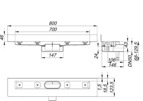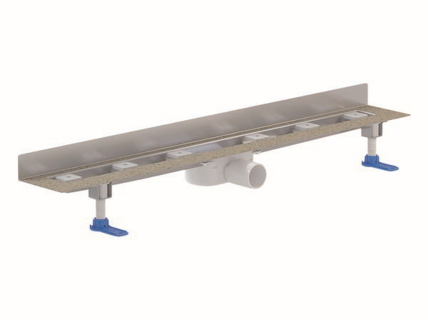 Bauhöhe 68 mm, für die Montage an der Wand, mit einem Ablaufgehäuse, Ablaufstutzen DN 50 horizontal, schallentkoppelnde Montagefüße zur Höheneinstellung, besandeter Flansch zum sicheren Anschluss an Verbundabdichtungen gem. DIN 18534, herausnehmbarer Geruchs- und Reinigungsverschluss, Sperrwasserhöhe 24 mm (abweichend von DIN EN 1253), höhenverstellbare Justierschrauben, Bauschutz, Fliesenanschlag, Rahmenklemmstück, Rinnenkörper Edelstahl 1.4301, Ablaufkörper Polypropylen, hochschlagfest