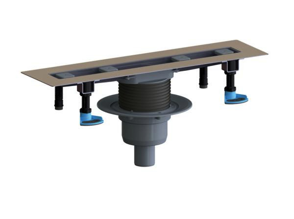 Bauhöhe 52 mm, für die Montage in der Fläche, mit einem Ablaufgehäuse, Ablaufstutzen DN 50 senkrecht, mit schallentkoppelnde Montagefüße zur Höheneinstellung, besandeter Flansch zum sicheren Anschluss an Verbundabdichtungen gem. DIN 18534, herausnehmbarer Geruchs- und Reinigungsverschluss, Sperrwasserhöhe 50 mm (gem. DIN EN 1253), höhenverstellbare Justierschrauben, Bauschutz, Fliesenanschlag, Rahmenklemmstück, Rinnenkörper Edelstahl 1.4301, Ablaufkörper Polypropylen, hochschlagfest