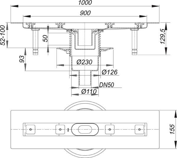 Bauhöhe 52 mm, für die Montage in der Fläche, mit einem Ablaufgehäuse, Ablaufstutzen DN 50 senkrecht, mit schallentkoppelnde Montagefüße zur Höheneinstellung, besandeter Flansch zum sicheren Anschluss an Verbundabdichtungen gem. DIN 18534, herausnehmbarer Geruchs- und Reinigungsverschluss, Sperrwasserhöhe 50 mm (gem. DIN EN 1253), höhenverstellbare Justierschrauben, Bauschutz, Fliesenanschlag, Rahmenklemmstück, Rinnenkörper Edelstahl 1.4301, Ablaufkörper Polypropylen, hochschlagfest
