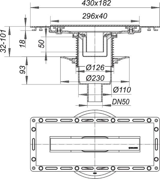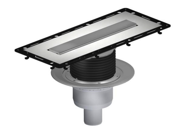 Ablaufstutzen DN 50 senkrecht, Vlies-kaschierter Flansch, Tisto-Dichtmanschette, Bauschutz, herausnehmbarer Geruchs- und Reinigungsverschluss, Sperrwasserhöhe 50 mm (gem. DIN EN 1253), höhenverstellbare Justierschrauben, Fliesenanschlag, Ablaufgehäuse Polypropylen, hochschlagfest, Abdeckung Edelstahl 1.4301, 300 x 40 mm, Belastungsklasse K 3 (300 kg), Standard 300 geeignet für Bodenbeläge 2-12 mm (mit Kleber), Design 300 geeignet für Bodenbeläge 5-15 mm (mit Kleber)