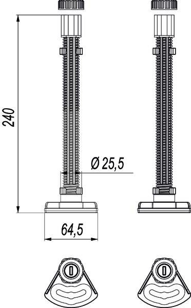 Ersatzteil zur Höhenanpassung von Ablaufgehäusen DallFlex und CeraFlex, bestehend aus zwei schallentkoppelte Montagefüße mit Befestigungsmaterial und zwei schallentkoppelte Gewindestangen mit Kontermuttern, ABS, TPE, Polypropylen, hochschlagfest