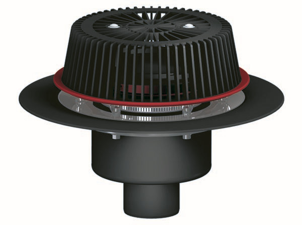 Ablaufleistungen nach DIN EN 1253, für den Einbau in Dachentwässerungsanlagen mit Druckströmung, Ablaufgehäuse wärmegedämmt, Ablaufstutzen senkrecht, SuperDrain-Einsatz, Anstauelement höhenverstellbar 28-68 mm, Laubfangkorb, verschraubt, Polypropylen, UV-stabilisiert, Edelstahl-Flanschring zur Befestigung von polymeren Dachdichtungsbahnen