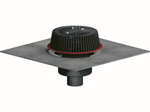 Ablaufleistungen nach DIN EN 1253, für den Einbau in Dachentwässerungsanlagen mit Druckströmung, Ablaufgehäuse wärmegedämmt, Ablaufstutzen senkrecht, SuperDrain-Einsatz, Anstauelement höhenverstellbar 28-68 mm, Laubfangkorb, verschraubt, Polypropylen, UV-stabilisiert, werkseitig aufgeschweißter Bitumenschweißbahn-Manschette, 500 x 500 mm, 5 mm stark, mit Edelstahl-Flanschring zur zusätzlichen Sicherheit