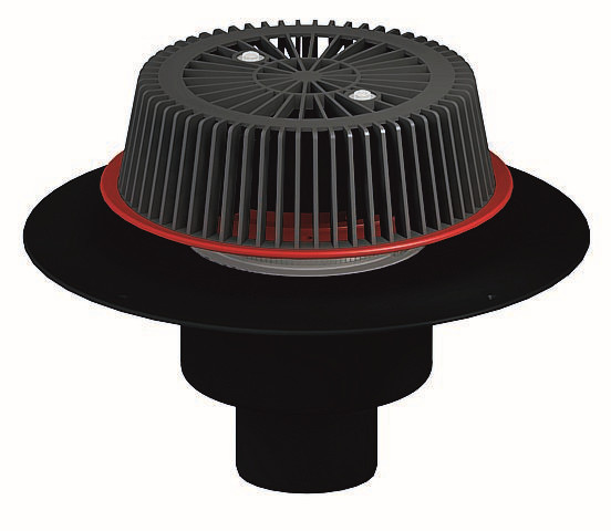 Ablaufleistungen nach DIN EN 1253, für den Einbau in Dachentwässerungsanlagen mit Druckströmung, Ablaufgehäuse wärmegedämmt, Ablaufstutzen senkrecht, SuperDrain-Einsatz, Anstauelement höhenverstellbar 28-68 mm, Laubfangkorb, verschraubt, extra breitem Flansch zum Anschluss von FPO-PP-Dachbahnen bzw. PE-Dampfsperrbahnen, Polypropylen, UV-stabilisiert