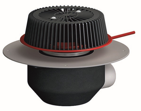 Ablaufleistungen nach DIN EN 1253, für den Einbau in Dachentwässerungsanlagen mit Druckströmung, Ablaufgehäuse wärmegedämmt, Ablaufstutzen DN 70 seitlich, 3° abgewinkelt, SuperDrain-Einsatz, Anstauelement höhenverstellbar 28-68 mm, Laubfangkorb, verschraubt, extra breitem Flansch zum Anschluss von PVC-Dachbahnen, aus PVC, Direktanschluss an 230 V, Heizband nach VDE 0721, Teil 1/3.78 geprüft, Leistungsaufnahme pro Dachablauf 15 W, Rechnungswert für Absicherung pro Dachablauf 0,06 Ampere, empfohlene Absicherung pro Dachanlage 16 Ampere
