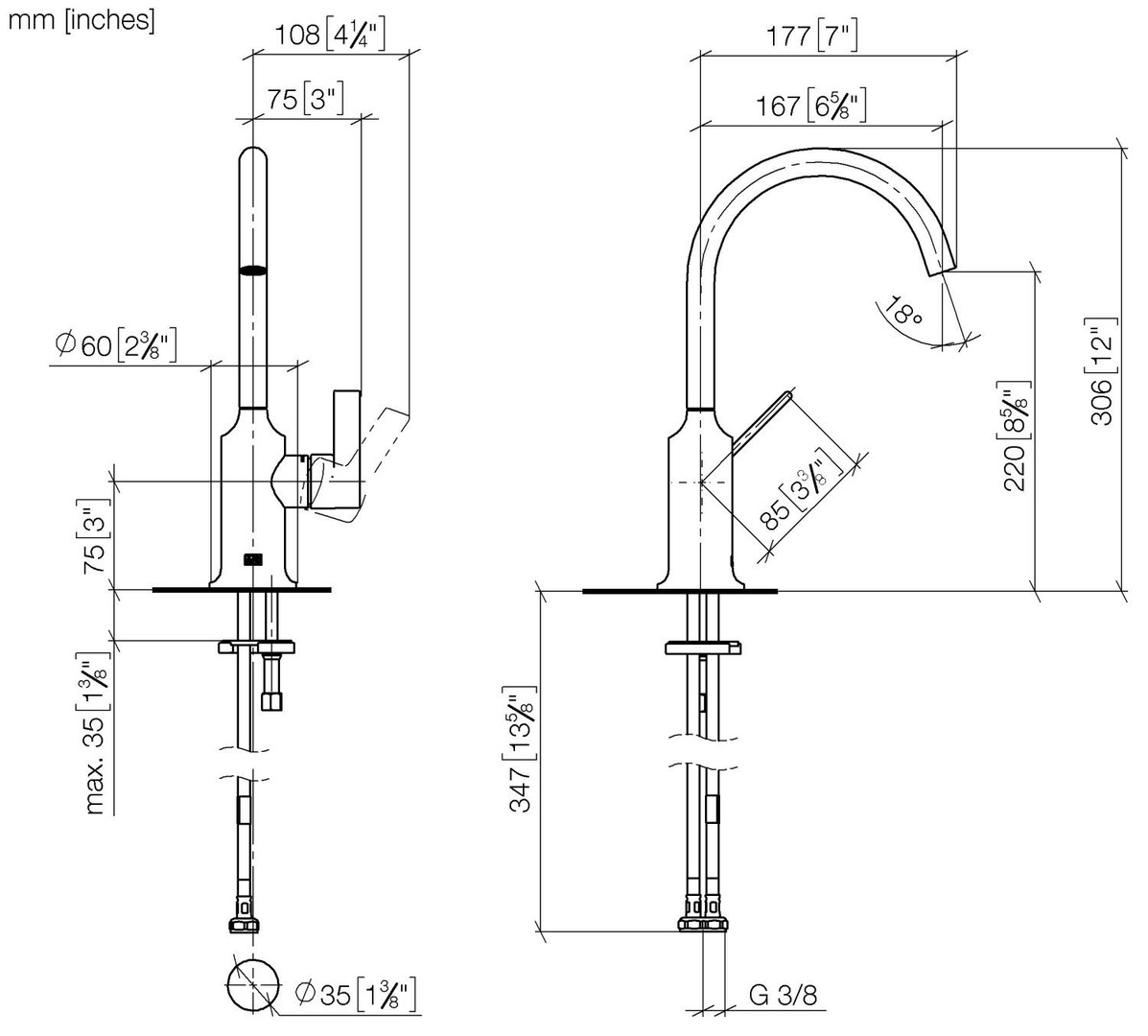Ausladung 167 mm, schwenkbarer Auslauf 360°, runder luftangereicherter Strahl, Armaturenhöhe 306 mm, Höhe bis Luftsprudler 220 mm, Bohrungsdurchmesser 35 mm, 2x Druckschlauch M 8 x 1 eingeschraubt, dichtheitsgeprüft, Durchfluss max. 5,7 l/min, bleifrei