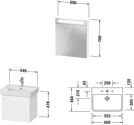 bestehend aus Spiegelschrank 60 x 70 cm, mit LED Licht und Schalter-Steckdosenkombination innen rechts, Tür rechts oder links, IP44, LED (Lebensdauer > 30.000 h), LED fest verbaut, Waschtisch 60 x 46 cm, mit Überlauf, Hahnlochbank, 1 Hahnloch durchgestochen, Waschtisch-Unterbau 54 x 42,6 x 47,8 cm, 1 Auszug, 1 Innenschubkasten, mit breiter Griffleiste, durchgehendes Frontmaterial, dadurch Easy to clean, Soft-Closing-Funktion, Möbel- und Kantenflächen wasserabweisend, Kanten wasserfest verleimt, fertig vormontiert und eingestellt, 3D-Justierung möglich