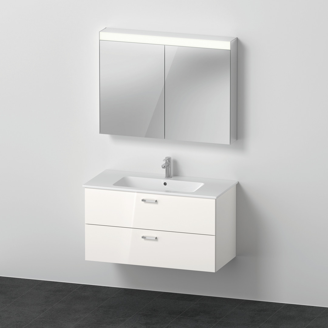 bestehend aus Spiegelschrank universal Licht und Spiegel, Better Version, 1 Tür links oder rechts, 81 x 14,8 x 76/103 x 14,8 x 76/123 x 14,8 x 76 cm, LED Randlichtfeld oben, 1 Schalter-Steckdoseneinheit innen, IP44, LED (Lebensdauer > 30.000 h), LED fest verbaut, Waschtisch Me by Starck Möbelhandwaschbecken, 83 x 49/103 x 49/123 x 49 cm, mit Überlauf, Hahnlochbank, 1 Hahnloch durchgestochen, Waschtisch Unterbau XBase, 80 x 47,5 x 55,2/100 x 47,5 x 55,2/120 x 47,5 x 55,2 cm, 2 Schubkästen, oberer Schubkasten mit Siphonausschnitt und Schürze, mit Soft-Close-Mechanismus
