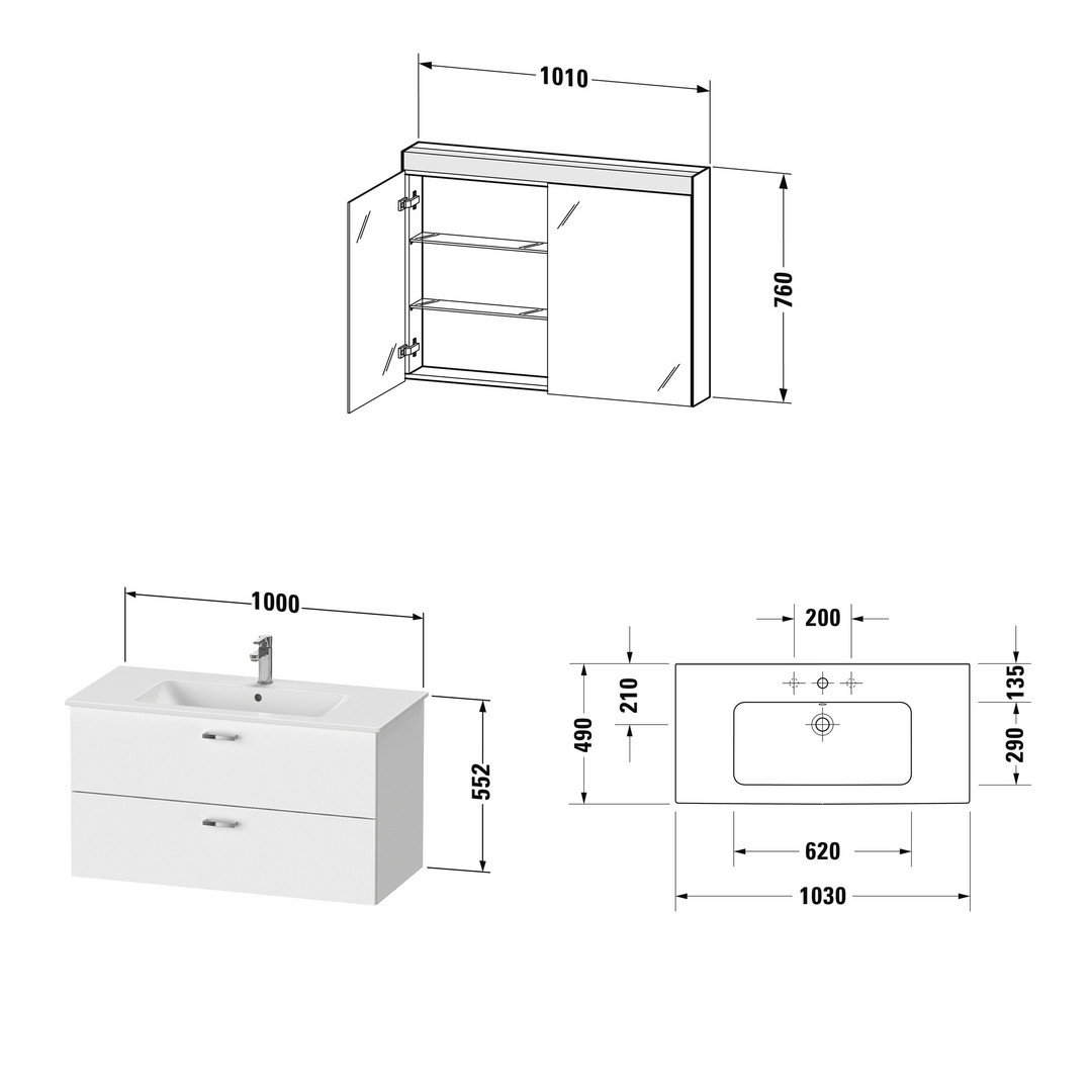 Duravit Möbel-Set XBase 103x49cm, WT, WTU 2 Schubkästen, Spiegelschrank, weiß glänzend DUXB007704545