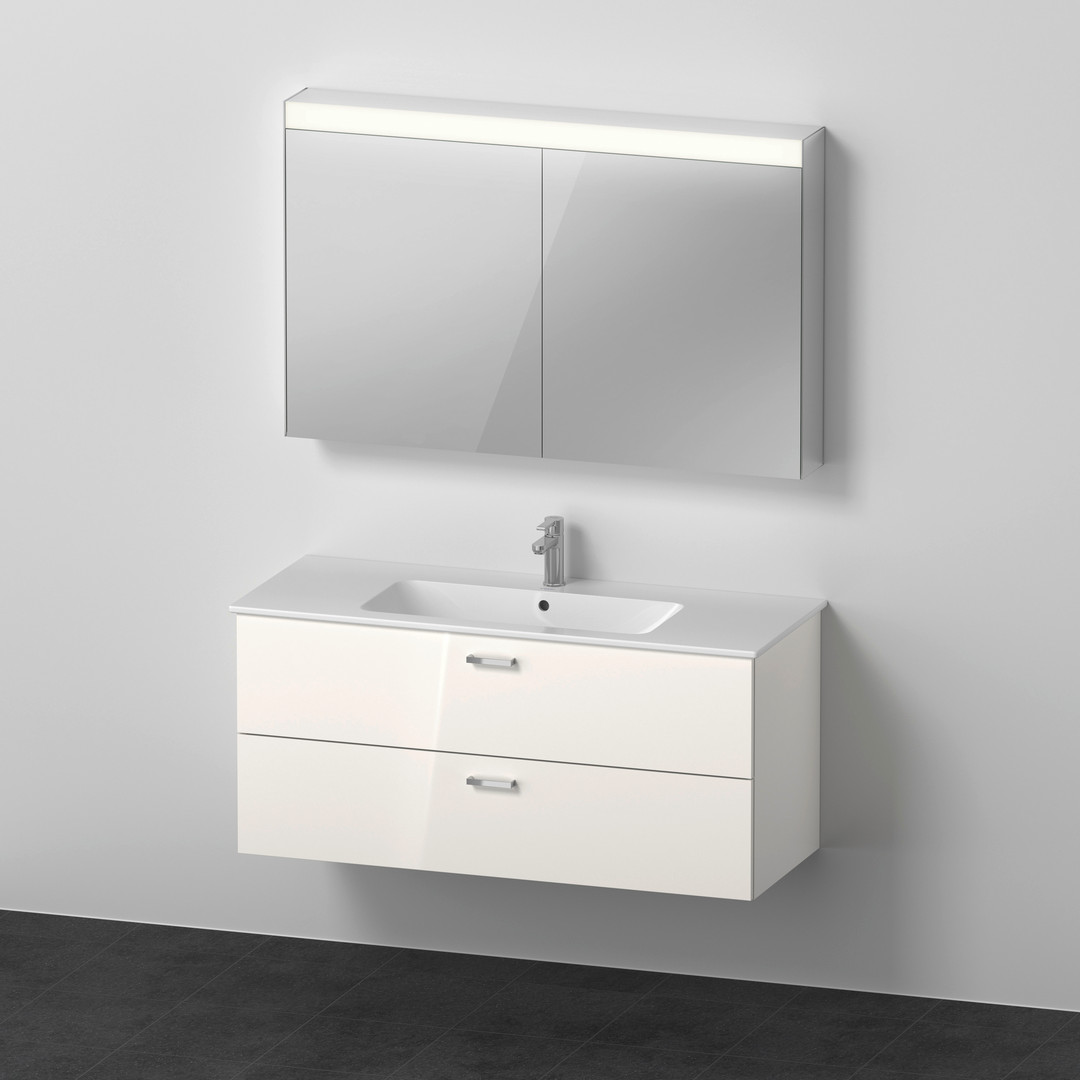 bestehend aus Spiegelschrank universal Licht und Spiegel, Better Version, 1 Tür links oder rechts, 81 x 14,8 x 76/103 x 14,8 x 76/123 x 14,8 x 76 cm, LED Randlichtfeld oben, 1 Schalter-Steckdoseneinheit innen, IP44, LED (Lebensdauer > 30.000 h), LED fest verbaut, Waschtisch Me by Starck Möbelhandwaschbecken, 83 x 49/103 x 49/123 x 49 cm, mit Überlauf, Hahnlochbank, 1 Hahnloch durchgestochen, Waschtisch Unterbau XBase, 80 x 47,5 x 55,2/100 x 47,5 x 55,2/120 x 47,5 x 55,2 cm, 2 Schubkästen, oberer Schubkasten mit Siphonausschnitt und Schürze, mit Soft-Close-Mechanismus