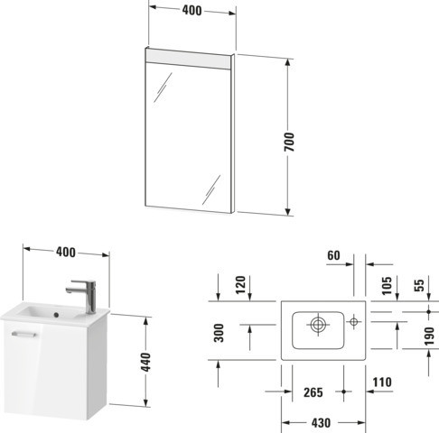 Möbelwaschtisch mit Waschtischunterbau und Spiegel XBase 288 x 400 x 2000 mm, mit Befestigungsmaterial