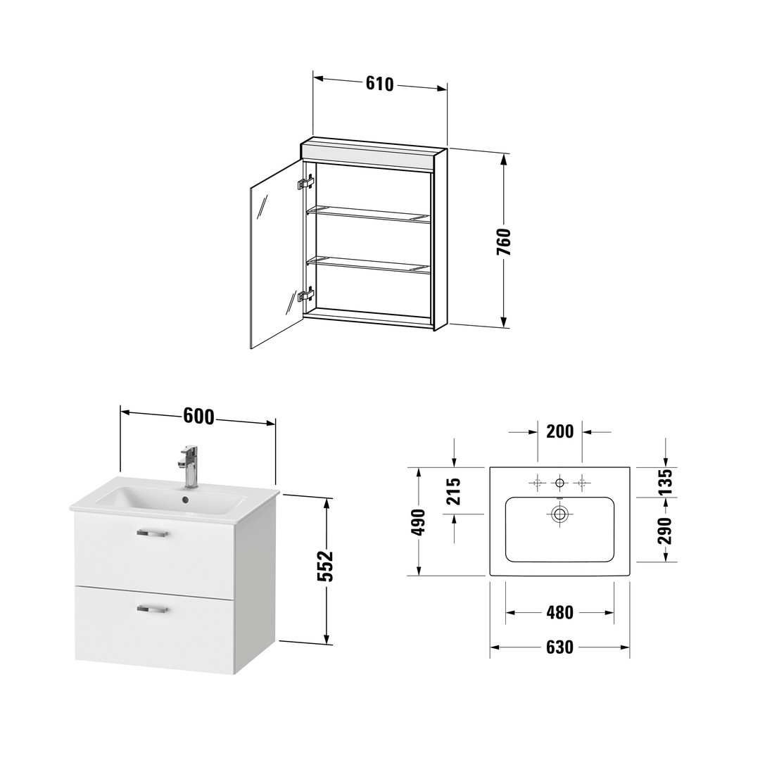 bestehend aus Spiegelschrank universal Licht und Spiegel, Better Version, 1 Tür links oder rechts, 61 x 14,8 x 76 cm, LED Randlichtfeld oben, 1 Schalter-Steckdoseneinheit innen, IP44, LED (Lebensdauer > 30.000 h), LED fest verbaut, Waschtisch Me by Starck Möbelhandwaschbecken, 63 x 49 cm, mit Überlauf, Hahnlochbank, 1 Hahnloch durchgestochen, Waschtisch Unterbau XBase, 60 x 47,5 x 55,2 cm, 2 Schubkästen, oberer Schubkasten mit Siphonausschnitt und Schürze, mit Soft-Close-Mechanismus