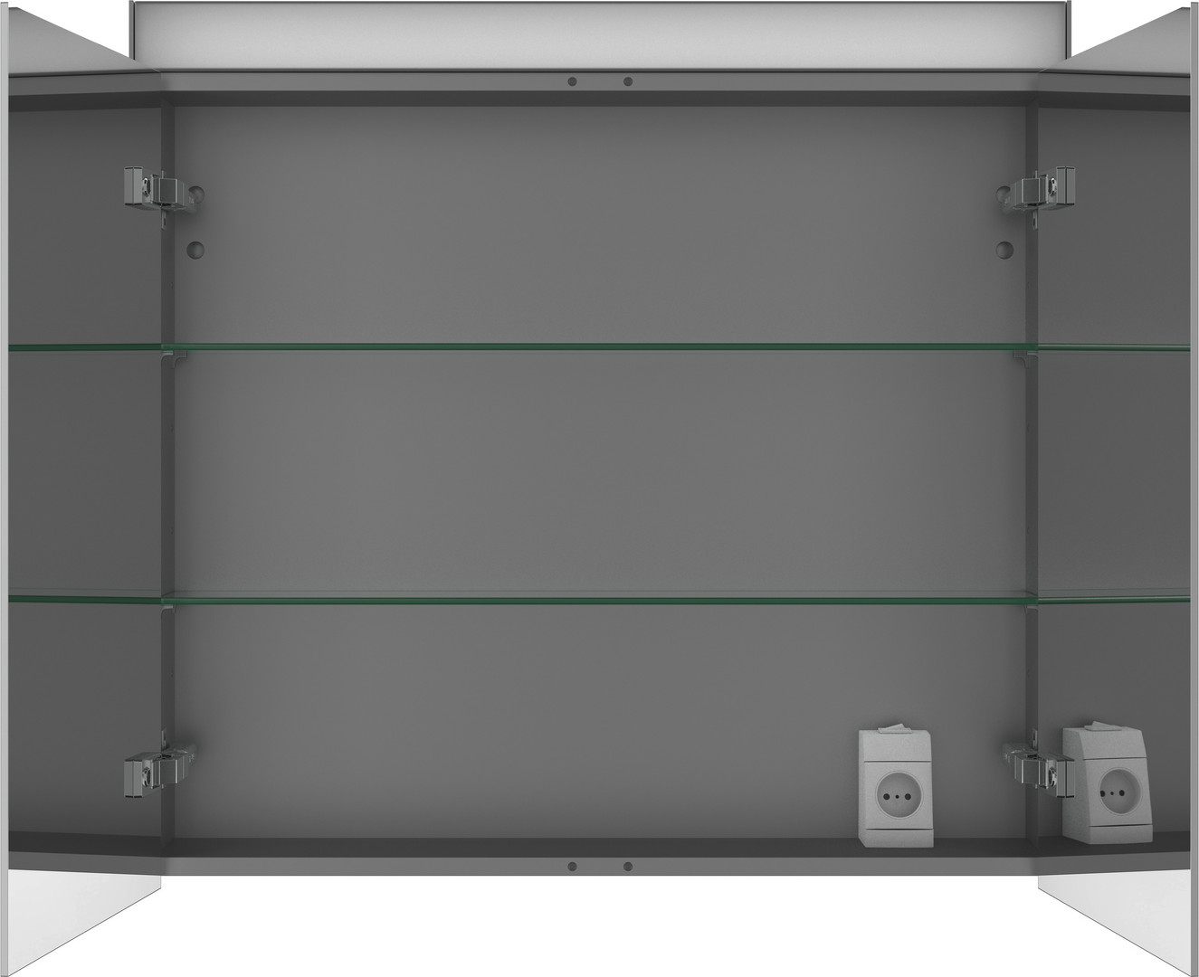 Lichtfeld oben, IP44, 2 Spiegeltür, 2 Glasfachböden, 1 Schalter-Steckdoseneinheit innen rechts, LED (Lebensdauer >30.000 Stunden), LED fest verbaut, LED Modul 4000 Kelvin Lichtfarbe, Abstand Sensor zu reflektierenden Oberflächen min. 7,5 cm, mit Einbauset, Einbaumontagerahmen MDF weiß, Einbaurahmen Aluminiumprofil weiß, Rahmenbreite 2,5 cm, Einbauset wird demontiert geliefert