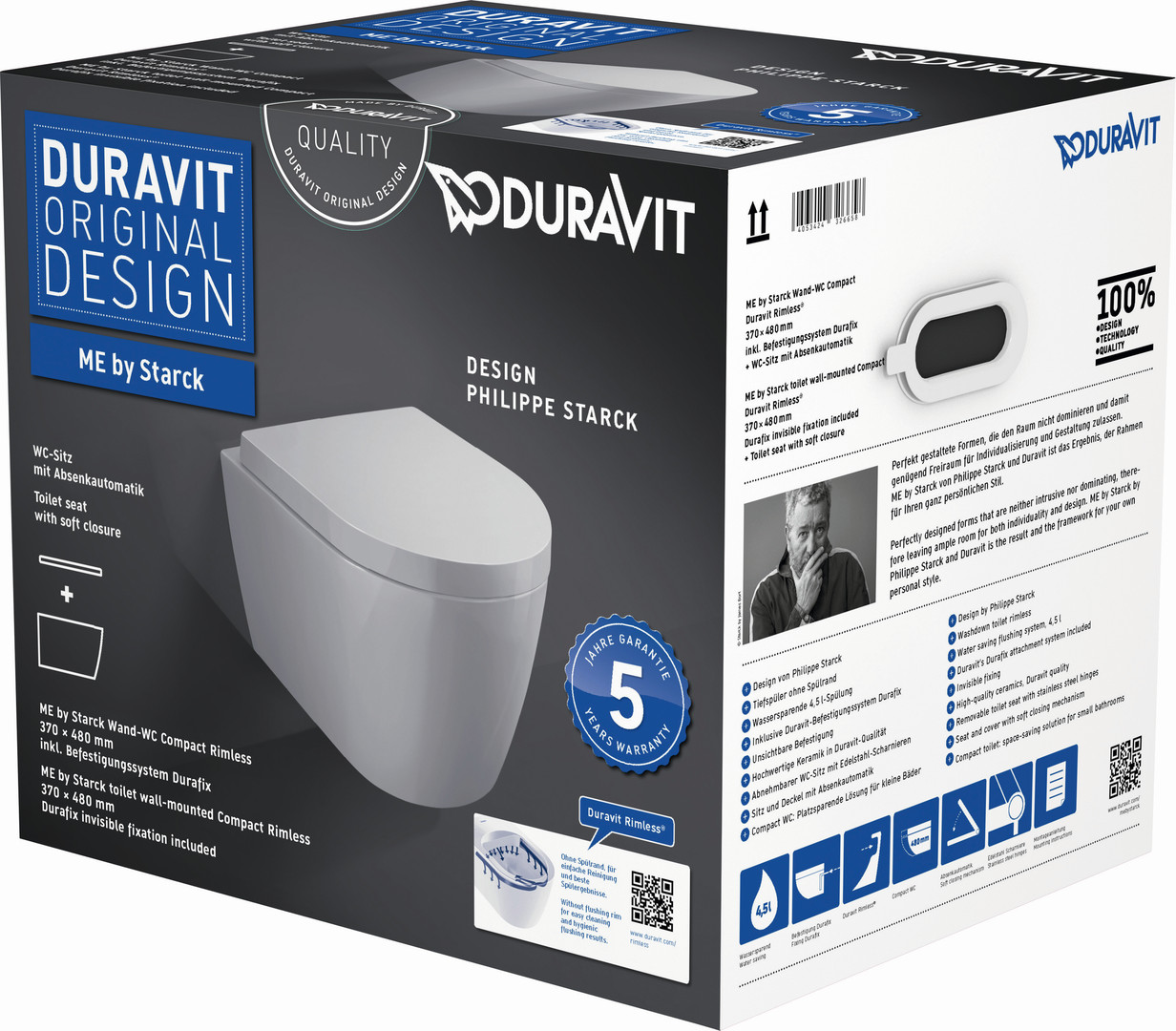 Duravit Wand-Tiefspül-WC Set Compact Me by Starck mit WC-Sitz, 4,5 l, Rimless, weiß