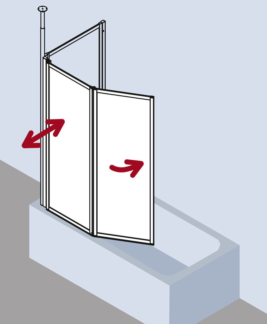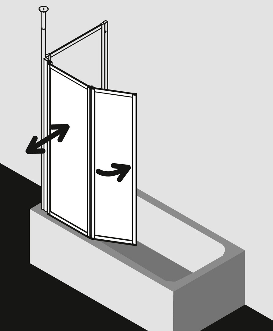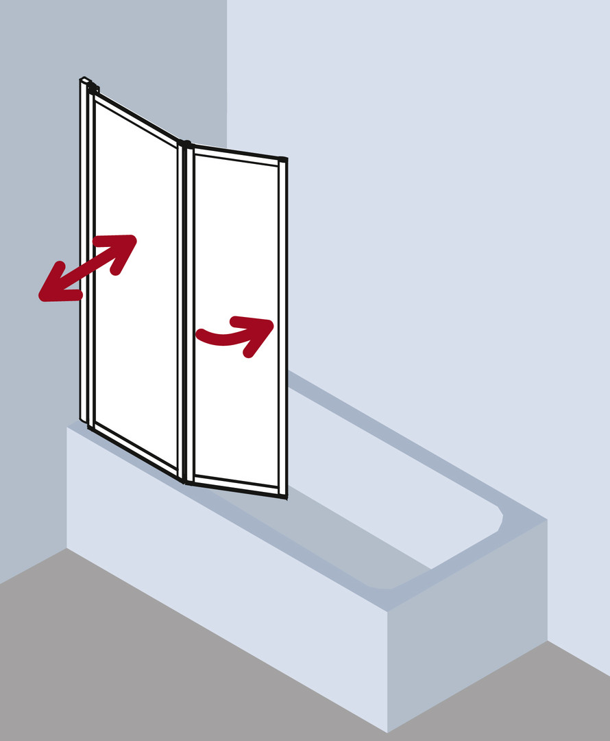 zum Einbau auf Badewanne, gerahmte Faltwand mit zwei Flügeln, im Wandprofil 90 Grad nach innen und außen schwenkbar, 2. Flügel 180 Grad nach innen schwenkbar, Verglasung 3 mm Einscheiben-Sicherheitsglas nach DIN EN 12150, Profile aus hochwertigem eloxiertem Aluminium, Verstellmöglichkeit im Wandprofil 16 mm, durchgehende Dichtprofile, waagerechte Dichtleisten, mit Befestigungsmaterial, Made in Germany, geprüft nach DIN EN 14428 (CE) und PPP 53005 (TÜV/GS), 20 Jahre Ersatzteil-Nachkaufsicherheit nach Auslauf des Modells, Qualitätssicherungssystem zertifiziert nach DIN EN ISO 9001:2015, Umweltmanagement zertifiziert nach DIN EN 14001:2015, Energiemanagement zertifiziert nach DIN EN 50001:2011
