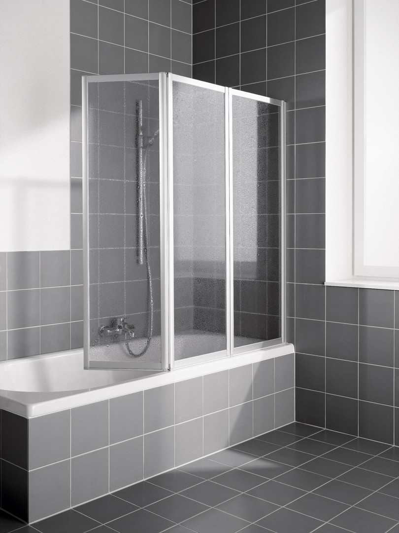 zum Einbau auf Badewanne, gerahmte Faltwand mit drei Flügeln, im Wandprofil 90 Grad nach innen und außen schwenkbar, 2. und 3. Flügel 180 Grad nach innen schwenkbar, Verglasung mit 3 mm Einscheiben-Sicherheitsglas nach DIN EN 12150, Profile aus hochwertigem eloxiertem Aluminium, Verstellmöglichkeit im Wandprofil 16 mm, durchgehende Dichtprofile, waagerechte Dichtleisten, mit Befestigungsmaterial, Made in Germany, geprüft nach DIN EN 14428 (CE) und PPP 53005 (TÜV/GS), 20 Jahre Ersatzteil-Nachkaufsicherheit nach Auslauf des Modells, Qualitätssicherungssystem zertifiziert nach DIN EN ISO 9001:2015, Umweltmanagement zertifiziert nach DIN EN 14001:2015, Energiemanagement zertifiziert nach DIN EN 50001:2011