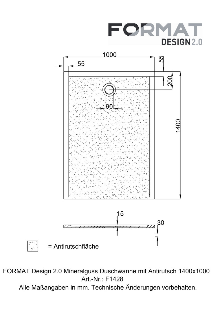 FORMAT Design 2.0 Duschwanne Mineralguss 140 x 90 x 3 cm, weiß, Ablauf kurze Seite, mit Antirutsch FO05080360004