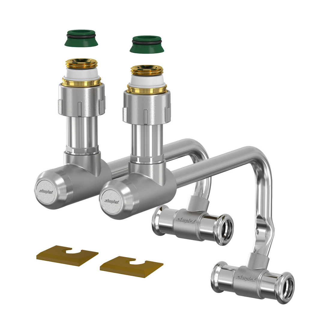 Sockelleisten-Anschlussgarnitur für den Anschluss von Ventil-Kompaktheizkörpern (Zweirohrsystem), mit Pressanschluss für Kupfer-, C-Stahl und Edelstahlrohre, verpressbar mit M- und V-Kontur, Dichtelement aus EPDM, max. Betriebstemperatur: 110 °C Dauertemperatur/130 °C kurzeitig, max. Betriebsdruck 10 bar, Ausstattung: 2x Teleskop-Eckverschraubungen mit Höhen- und Tiefenverstellung, 1x VL-Anschluss mit eingelötetem Kupferbogen (vernickelt) Ø 12 mm, 1x RL-Anschluss mit eingelötetem Kupferbogen (vernickelt) Ø 12 mm, 2x selbstdichtende Anschlussnippel für Heizkörper mit RP 1/2 Innengewinde, 2x Konusteile für Heizkörper mit G 3/4 M Außengewinde, je 2x Abdeckrosetten weiß/Buche und Eiche dunkel