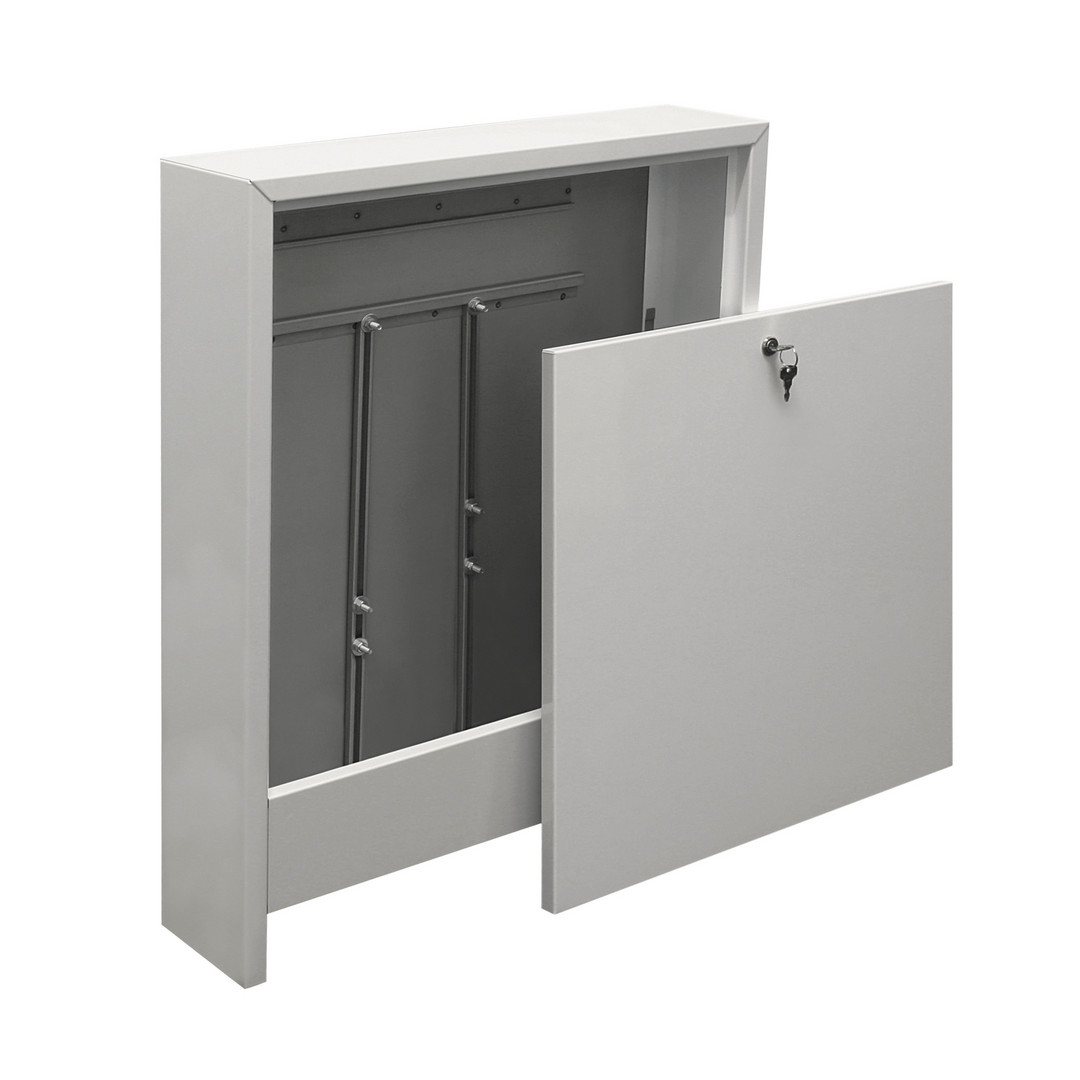 Für Simplex Verteiler, mit Verteilermontageschiene, Pulverbeschichtung, aus verzinktem Stahlblech in geschlossener Ausführung, Frontklappe mit Schlüsselschloss, glatte Seitenteile, Vor- und Rücklaufanschlüsse von unten, Clipschiene für Reglermodulleiste, Rohrumlenkschiene, im Karton verpackt, abnehmbare Rückwand