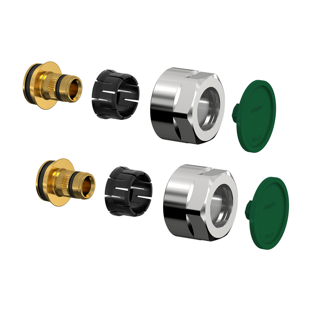 2x Klemmverschraubungen zum Anschluss von Design-Badarmaturen, für Kunststoff- und Metallverbundrohre, passend für G 3/4 F Eurokonus, Mutter SW 27, Kunststoff-Klemmring und Tülle, O-Ring- Dichtung auf der Tülle, mit Festanschlag, Dichtmaterialien aus EPDM, Druck- bzw. Temperaturbelastung entsprechend den Angaben der Rohrhersteller