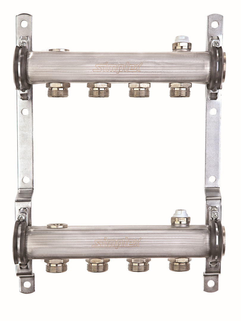 bestehend aus 2x Verteilerbalken DN 32 für Vor- und Rücklauf, Anschlüsse primär RP 1 für Simplex Verteileranschluss-Sets (F14022 und F14023), Anschlüsse sekundär G 3/4 M Eurokonus, vormontiertes Entlüftungsventil und Verteilerstopfen DN 15 je Balken, nachrüstbar z. B. mit Tauchhülse, Ventile und Zubehörteile aus Messing vernickelt, max. Betriebstemperatur 110 °C, max. Betriebsdruck 10 bar