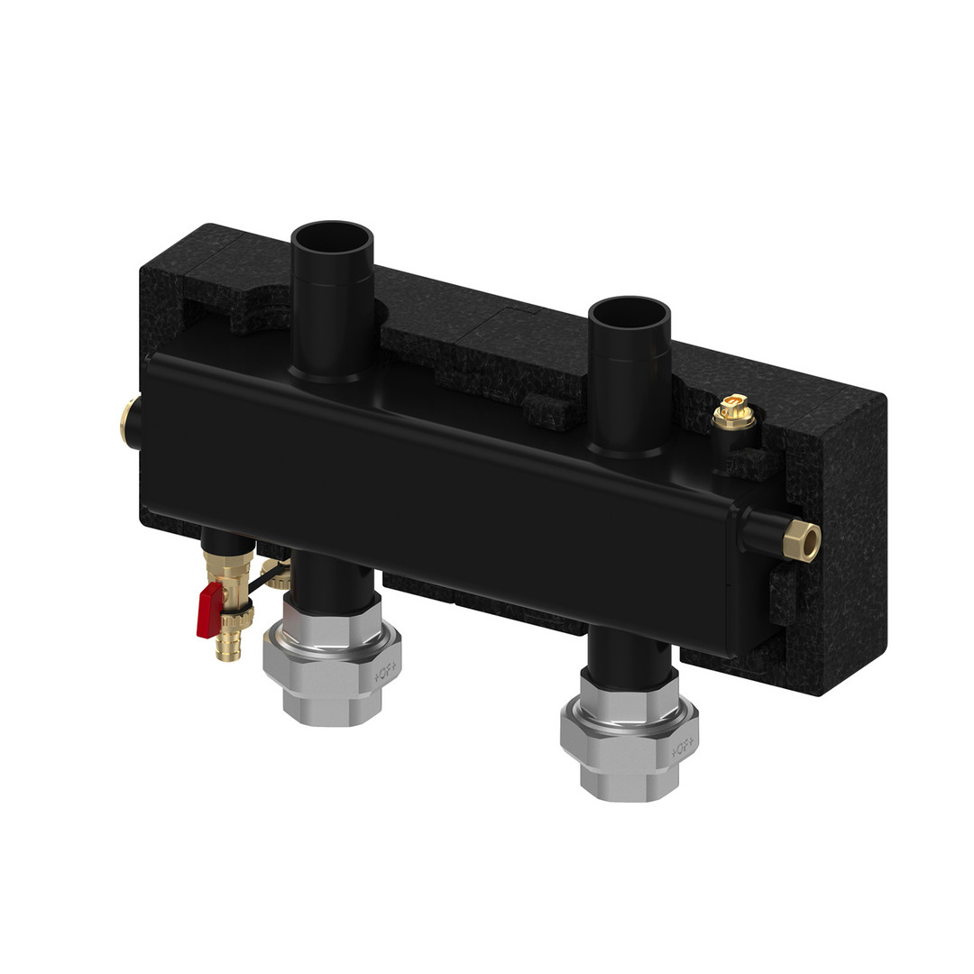 mit Luft- und Schlammabscheider, zur horizontalen oder vertikalen Montage, mit Handentlüfter und KFE-Hahn, mit Schlauchtülle und Kappe, Tauchhulse3/8" F (Innendurchmesser 10 mm) für Vorlauftemperaturfühler, Verschraubungen: 1 Anschlusspaar 1 1/2" M (oben)/1 1/2" F (kesselseitig), komplett mit Isolierung, Achsabstand 200 mm, max. zuäassige Druckstufe PN 6., max. zulässige Temperatur 110 °C