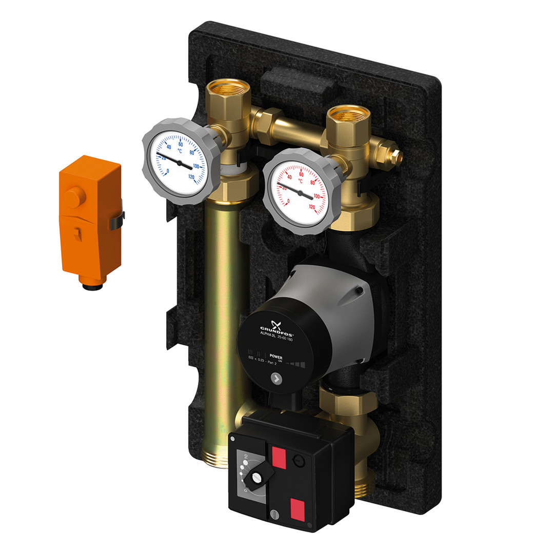 für gemischten Heizkreis mit konstanter Vorlauftemperatur, mit Mischer für Fußbodenheizung, Vorlauftemperatur am 3-Wege-T-Mischer einstellbar, durch einstellbaren Bypass wird Wasser aus dem Rücklauf in den Vorlauf beigemischt, mitgeliefertes Anlegethermostat dient als Sicherheitstemperaturwächter (STW), Umwälzpumpe EL 180 mm mit Anschlusskabel, 2 Kugelhähne mit handaufstellbarer Schwerkraftbremse im Rücklauf, 2 Kontaktthermometer, 3-Wege-T-Mischer mit einstellbarem Bypass, Anlegethermostat, Wandhalterung, Rücklaufrohr, mit Stellmotor (230 V, 50 Hz) mit integrierter Temperaturregelung (0-95 °C), Vorlauftemperaturfühler im Vorlaufkugelhahn, EPP-Isolierung, komplett montiert