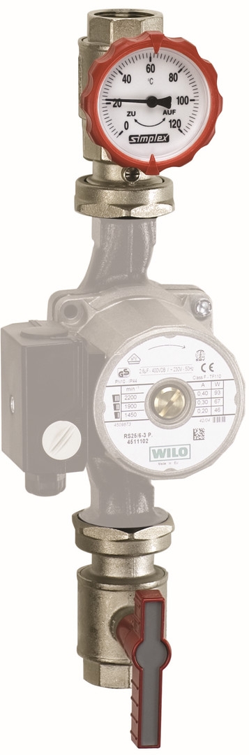für den Einsatz in Warmwasser-Heizungsanlagen, Dichtmaterialien: EPDM/PTFE, max. Betriebstemperatur 110 °C Dauertemperatur/130 °C kurzzeitig, max. Betriebsdruck 10 bar, bestehend aus: 1x Pumpen-Kugelhahn mit Schwerkraftbremse und rotem Thermometergriff, 1x Pumpen-Kugelhahn mit rotem Flügelgriff, einschließlich 2 Überwurfmuttern