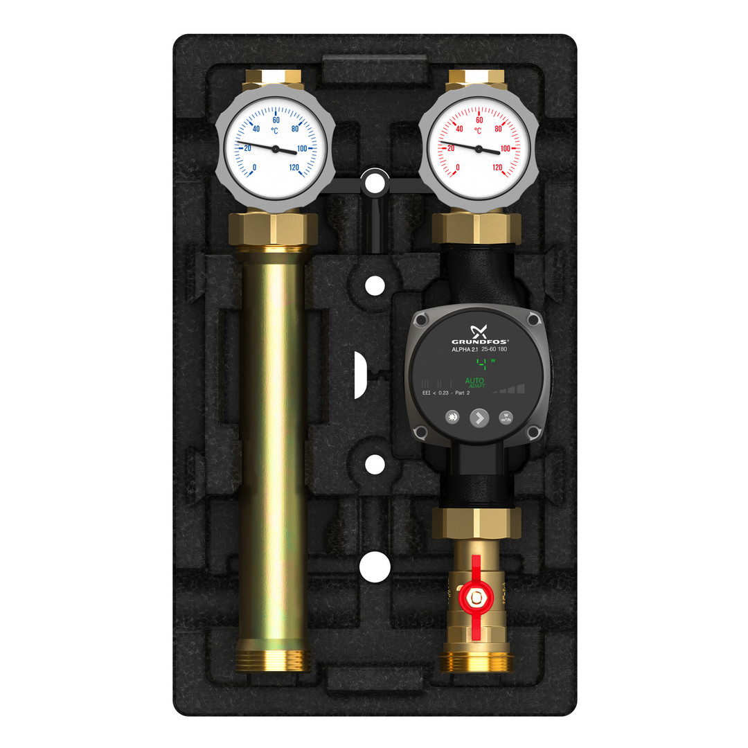 ungemischter Heizkreis und Speicherladung für Verteiler bis 70 kW, bzw. Wandmontage geeignet, mit oder ohne Umwälpumpe EL 180 mm mit Anschlusskabel, 2 Kugelhähne rücklaufseitig mit handaufstellbarer Schwerkraftbremse, 2 im Kugelhahngriff integrierte Kontaktthermometer (Anzeigebereich 0-120 °C), 1 Pumpenkugelhahn mit Meibes-Flansch, EPP-Isolierung, unterer Abgang 1 1/2" IG flachdichtend, oberer Abgang mit Innengewinde entsprechend Pumpendimension, Wandhalterung