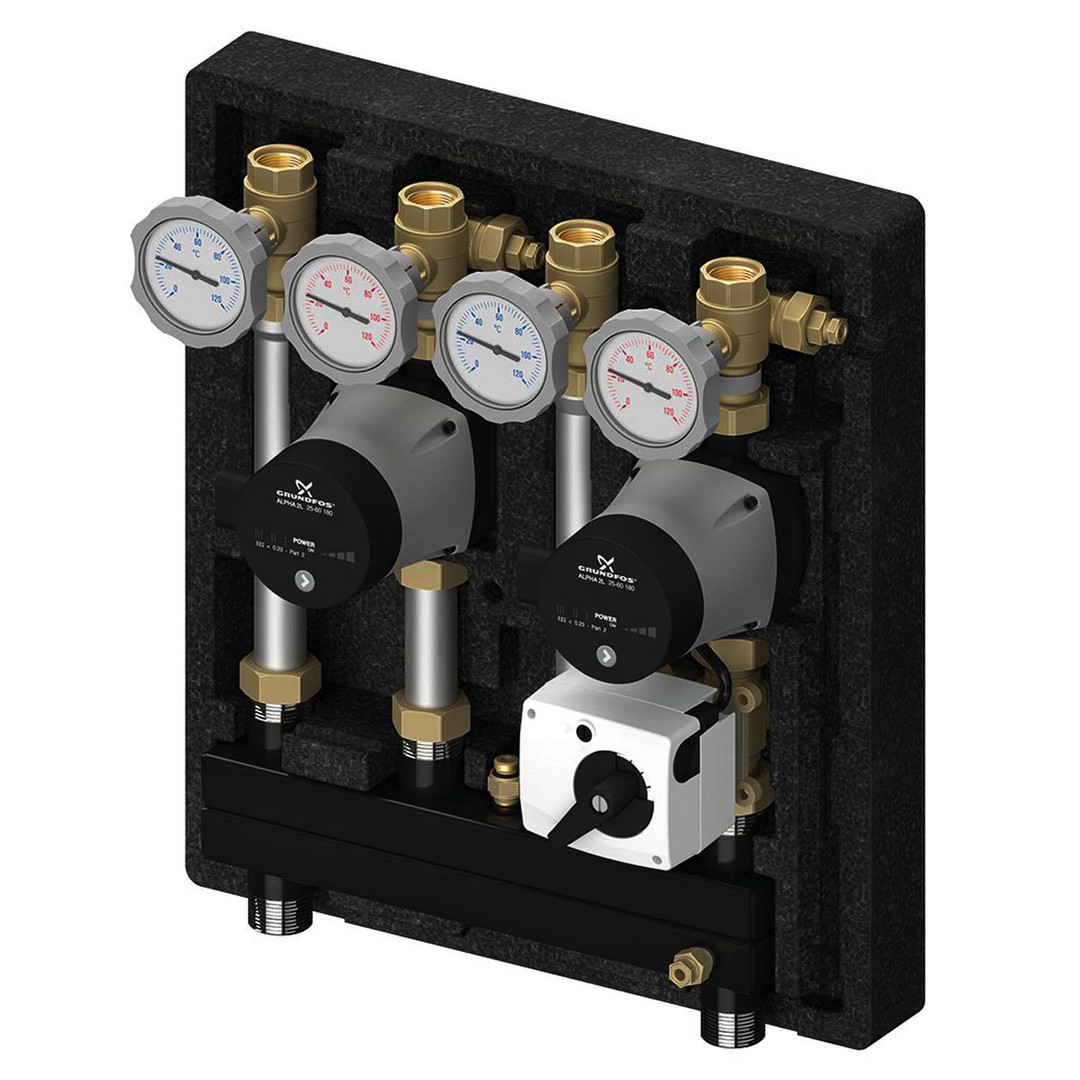 wärmegedämmte, kompakte Pumpengruppe für 2 verschiedene oder gleiche Heizkreise (UK/MK), hydraulisch anpassbarer gemeinsamer Verteiler, Anschlussmöglichkeiten für Temperatursensoren, Rückflussverhinderer im jeweiligen Vorlauf, Kontaktthermometer in Griffstücken von Vor- und Rücklauf integriert, dritter Heizkreis z.B. für Speicherladung im optionalen Zubehör
