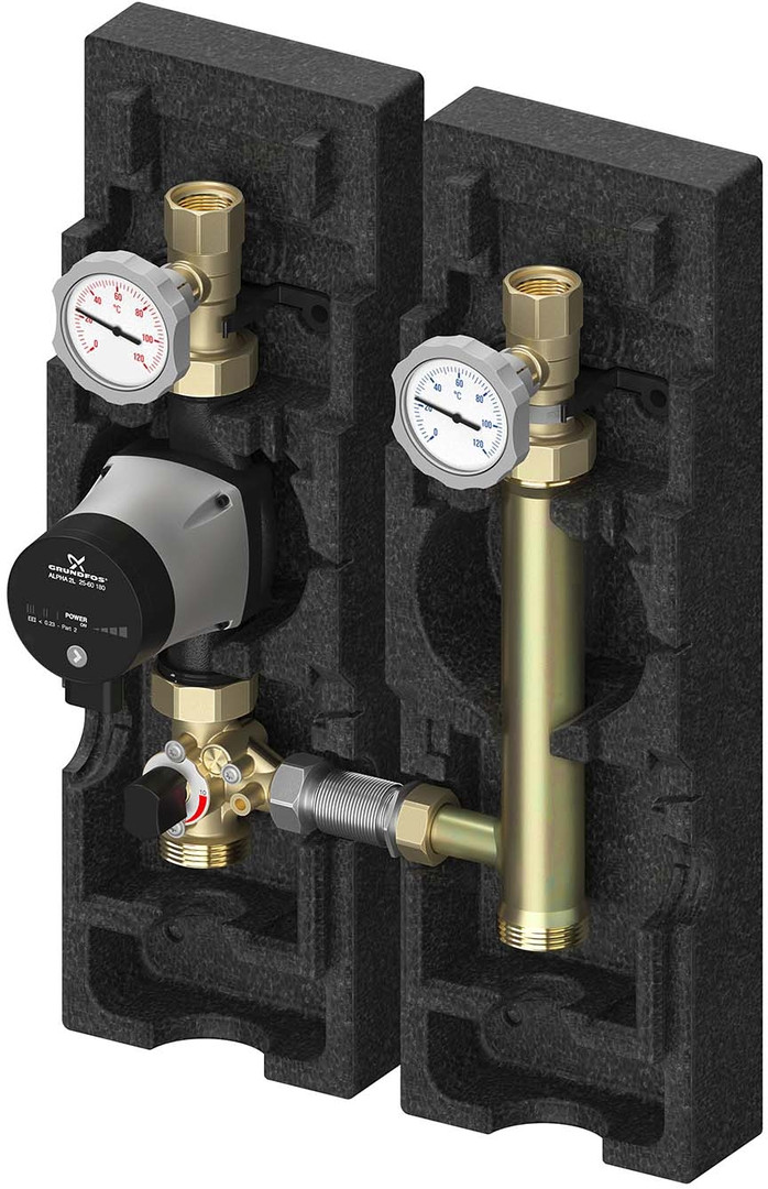 komplett mit oder ohne Umwälzpumpe (EL 180 mm) mit Anschlusskabel, zwei 2- Wege- Kugelhähne (rücklaufseitig mit handaufstellbarer Schwerkraftbremse), zwei im Kugelhahngriff integrierte Kontaktthermometer (Anzeigebereich 0-120 °C), ein 3-Wege-T-Mischer mit stufenlos einstellbaren Bypass, EPP-Isolierung, Achsabstand ab 200 mm (größer 250 mm mit Mehrpreis erhältlich), unterer Abgang 1 1/2" AG flachdichtend, oberer Abgang IG entsprechend Pumpendimension