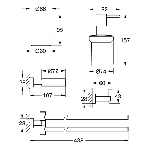 Material Glas/Metall, bestehend aus Seifenspender mit Halter (40 756), Glas mit Halter (40 755 001), Handtuchhalter, 2-armig (40 624 001), Bademantelhaken (40 511), StarLight Oberfläche