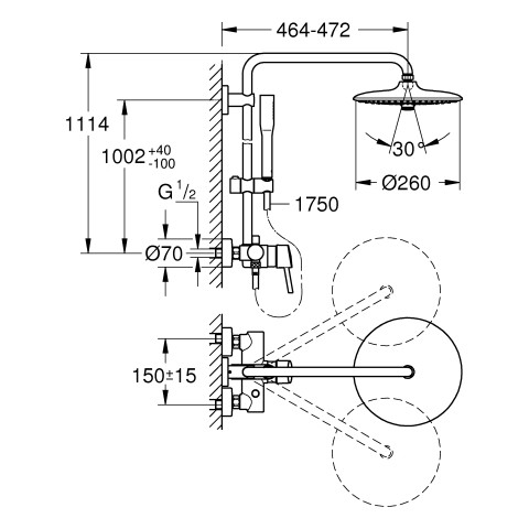 bestehend aus: horizontal schwenkbaren 45 cm Brausearm, Aufputz-Einhebel-Brausearmatur mit Umstellung, ermöglicht den Wechsel zwischen Euphoria 260 Kopfbrause (26 457), 3 Strahlarten Rain, SmartRain, Jet, mit Kugelgelenk, Drehwinkel +/-15°, Handbrause Euphoria Cosmopolitan Stick (27 400), Strahlarten Rain, in der Höhe verstellbar mittels Gleitelement, Brauseschlauch Silverflex 175 cm (28 388), SilkMove 4,6 cm Keramikkartusche, DreamSpray Strahlbild, Long-Life Oberfläche, Water Saving 9,5 l/min Durchflusskonstanthalter, FastFixation obere Konsole variabel, innenliegende separate Wasserführung, SpeedClean Antikalk-System, TwistStop gegen Verdrehen des Brauseschlauchs, für Durchlauferhitzer ab 18 kW/h geeignet, Mindestdurchfluss 7 l/min