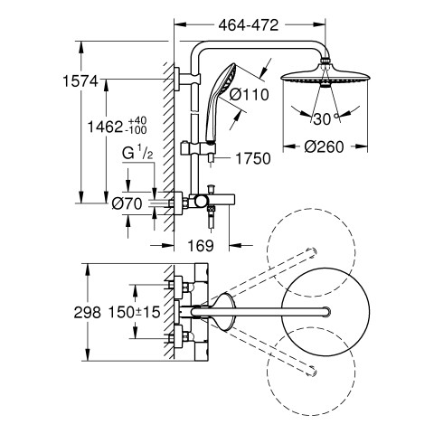 bestehend aus: horizontal schwenkbaren 45 cm Brausearm, Aufputz-Thermostat mit Aquadimmer-Funktion, ermöglicht Wechsel zwischen Euphoria 260 Kopfbrause (26 457), 3 Strahlart Rain, SmartRain, Jet, mit Kugelgelenk, Drehwinkel +/-15°, separate Umstellung auf Handbrause, Handbrause Euphoria 110 Massage (27 239) 3 Strahlarten: Rain, Massage, SmartRain, in der Höhe verstellbar mittels Gleitelement, Brauseschlauch Silverflex 175 cm (28 388), TurboStat Kompaktkartusche mit Dehnstoff-Thermoelement, SafeStop Sicherheitssperre bei 38 °C, SafeStop Plus optional einsetzbarer Temperaturendanschlag bei 43 °C, DreamSpray Strahlbild, Long-Life Oberfläche, SprayDimmer stufenlose Reduktion der Durchflussmenge, Water Saving 9,5 l/min Durchflusskonstanthalter, FastFixation obere Konsole variabel, innenliegende separate Wasserführung, SpeedClean Antikalk-System, TwistStop gegen Verdrehen des Brauseschlauchs, für Durchflusserhitzer ab 18 kW/h geeignet, Mindestdurchfluss 7 l/min
