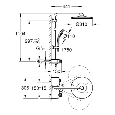 bestehend aus horizontaler Brausearm 45 cm, obere Konsole variabel zur minimalen Anpassung an vorhandene Bohrlöcher, Aufputz-Thermostat mit SmartControl, ermöglicht den Wechsel zwischen Kopfbrause Rainshower SmartActive 310, 2 Strahlarten PureRain und ActiveRain, Handbrause Euphoria 110 Massage, 3 Strahlarten: Rain, SmartRain, Massage, in der Höhe verstellbar mittels Gleitelement, Brauseschlauch Silverflex 175 cm (28 388), DreamSpray Strahlbild, Long-Life Oberfläche, CoolTouch kein Verbrennen an heißen Oberflächen, TurboStat Kompaktkartusche mit Dehnstoff-Thermoelement, ProGrip mit Rändelstruktur, Water Saving weniger Wasser, SafeStop Sicherheitssperre bei 38 °C, SafeStop Plus optional einsetzbarer Temperaturendanschlag bei 43 °C, SmartControl: An/Aus per Knopfdruck und Volumensteuerung durch Drehen, integrierte EasyReach Duschablage, SpeedClean Antikalk-System, TwistStop gegen Verdrehen des Brauseschlauchs, für Durchlauferhitzer ab 18 kW/h geeignet, Mindestdurchfluss 7 l/min