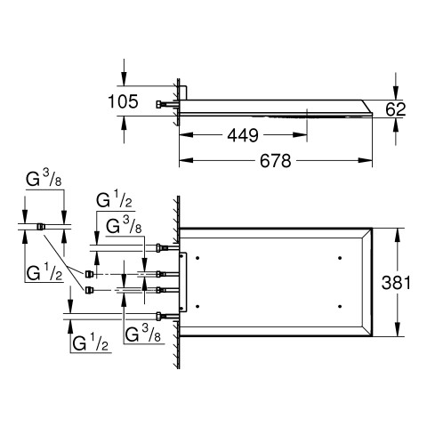 Brausestrahl Rain, Bokoma Spray, XL Wasserfall und Kombinationen, 381 x 60 x 677 mm, Material Metall, DreamSpray Strahlbild, Long-Life Oberfläche, XL Waterfall extra breiter Wasserfall , SpeedClean Antikalk-System, Durchfluss einzelner Strahlarten bei 3 bar, 1x Rain spray 300 mm ca. 20 l/min, 2x XL Wasserfall 1 Wasserfall 20 l/min, 2 Wasserfälle 32 l/min, 4 x Bokoma Spray mit 20° Verstellwinkel: 20 l/min, Rohbauset 26 855 muss separat bestellt werden, Ansteuerung der Kopfbrause über 4 Abgänge