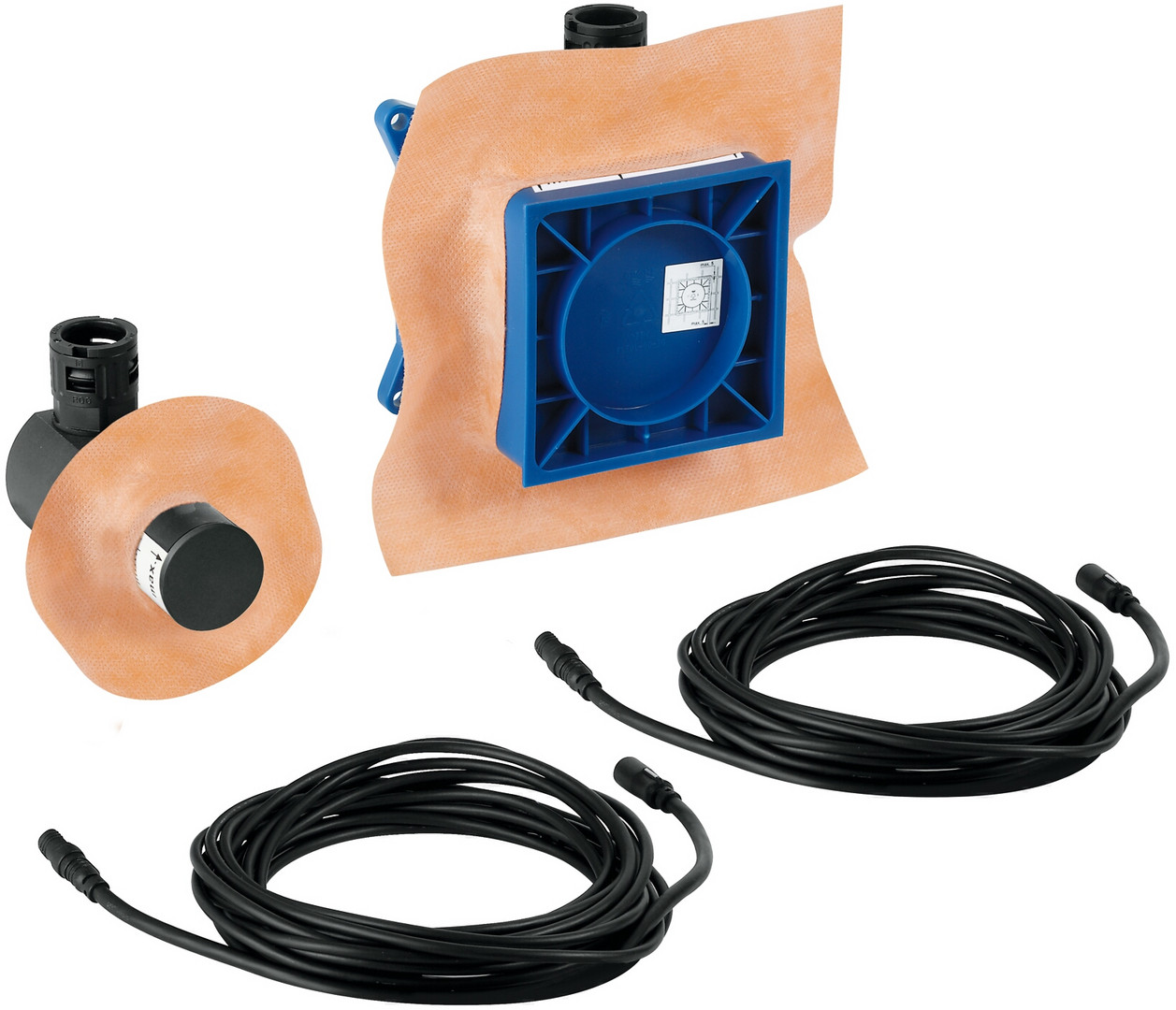 bestehend aus: 1x Rohbauset Dampfauslass (11,5 x 11,5 x 4,9-7,7 cm), 1x Rohbauset Temperaturfühler (5,8 x 8,3 x 8-10,5 cm), 1x Verlängerungskabel Temperaturfühler 5 m, 1x Verlängerungskabel Dampfgenerator 5 m