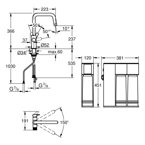 separater Griff für gefiltertes Wasser, SilkMove 28 mm Keramikkartusche, schwenkbarer Rohrauslauf, Schwenkbereich 150°, getrennte Wasserführung für gefiltertes und ungefiltertes Wasser, flexible Anschlussschläuche, Blue Umkehrosmose+ System, Umkehrosmose Filter für reines und sicheres Wasser, Filterung von Chemikalien, Hormonen und Mikroorganismen, Mineralisierungsfilter reichert Trinkwasser mit Magnesium und Silikat an, Durchfluss 1,5 l/min, Salzabweisung mehr als 97 %, Wirkungsgrad min. 50 %, Speisewasser Druck 1-4 Bar, 230 V/50 Hz, kein Wasserspeicher erforderlich, Filterlebensdauer 1 Jahr, Anschluss Set