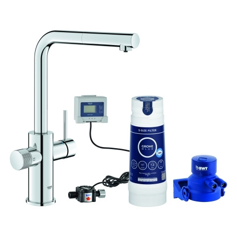 GROHE Spültisch-Einhebelmischer Blue Pure Minta L-Auslauf, Starter Kit, S-Size Filter, herausziehbarem Mousseurauslauf, chrom