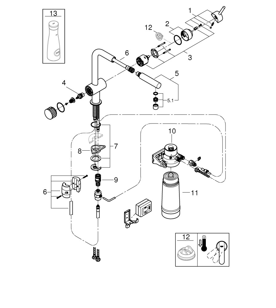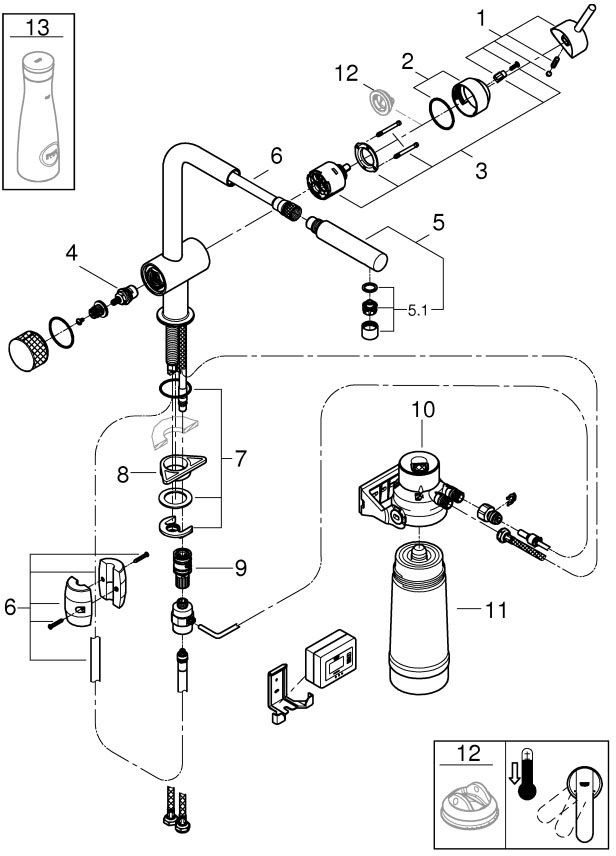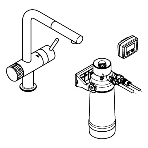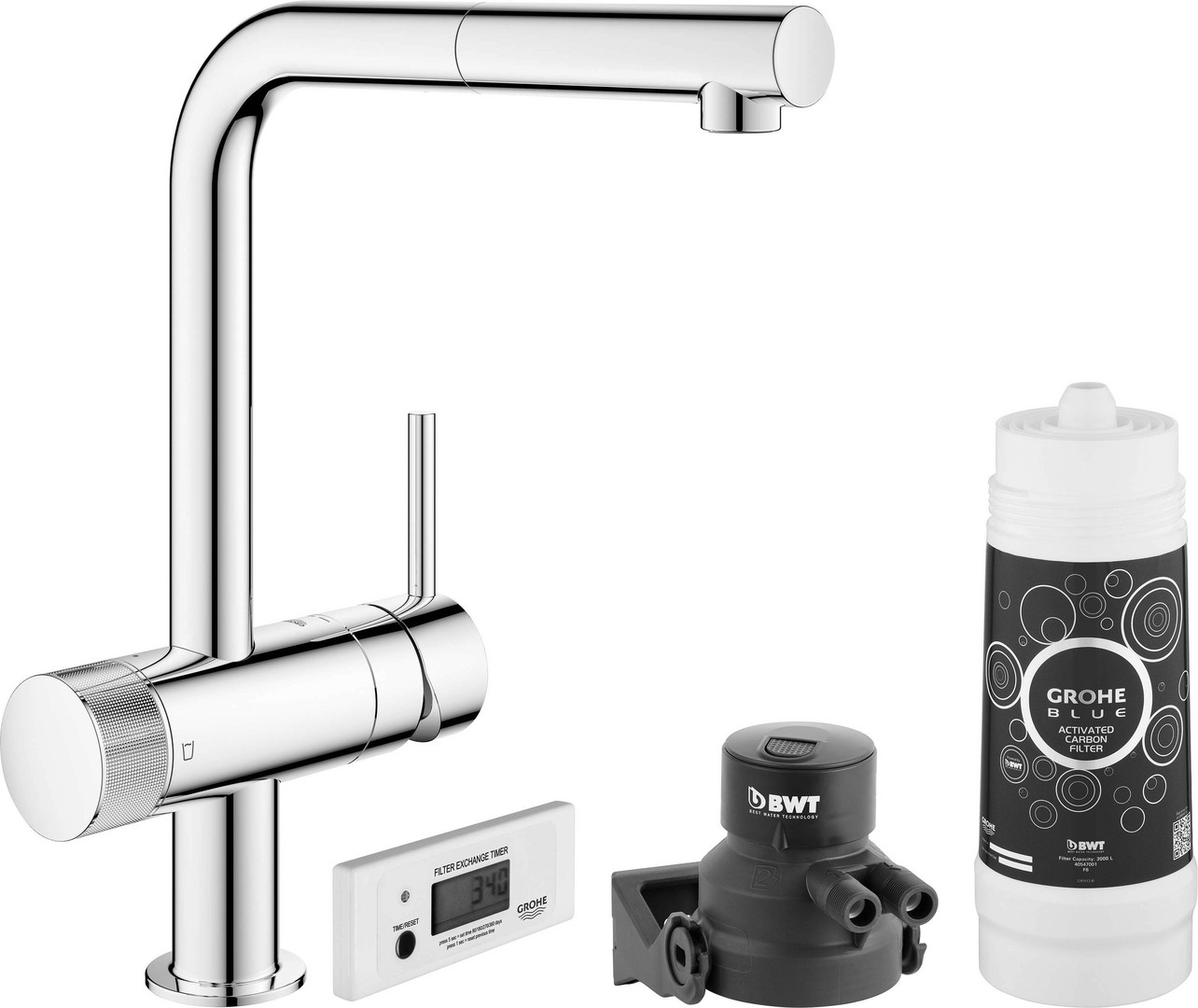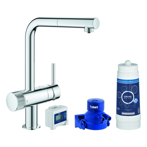 GROHE Spültisch-Einhebelmischer Blue Pure Minta L-Auslauf, Starter Kit, herausziehbarer Mousseurauslauf, chrom