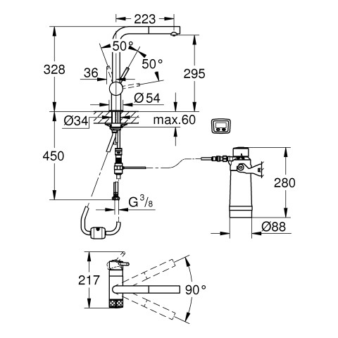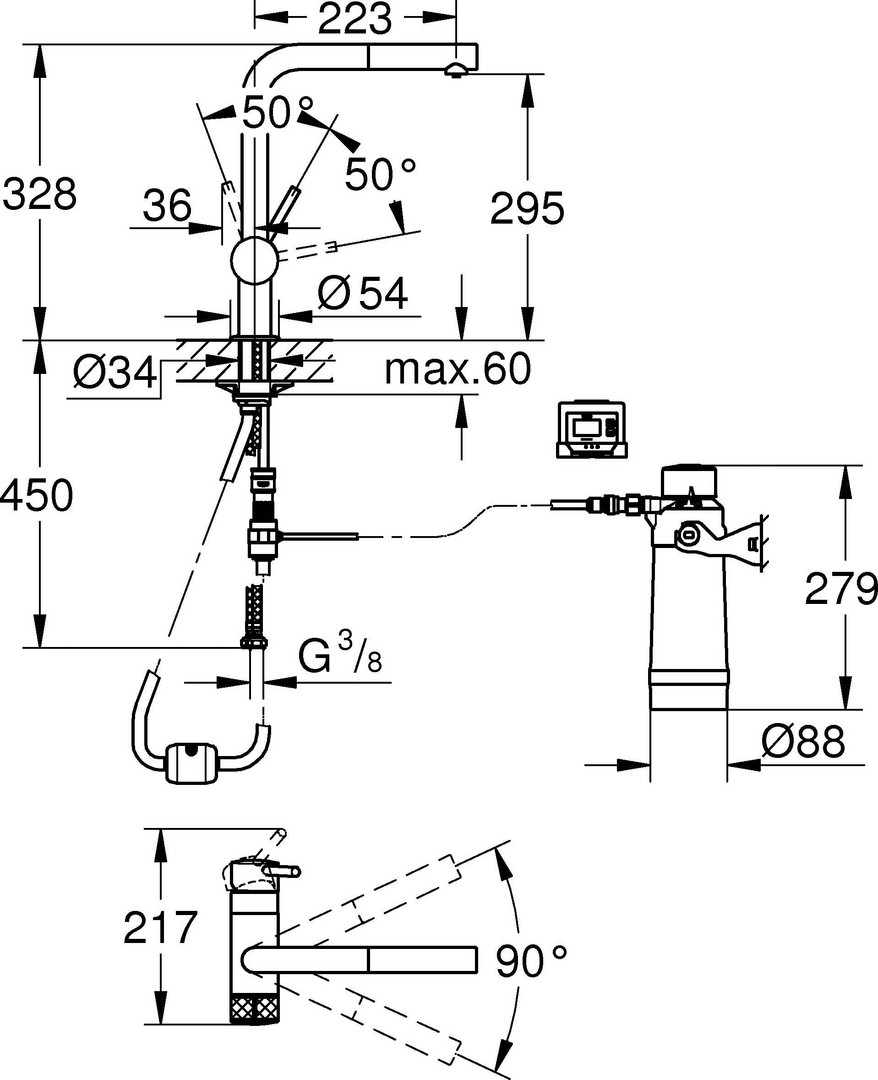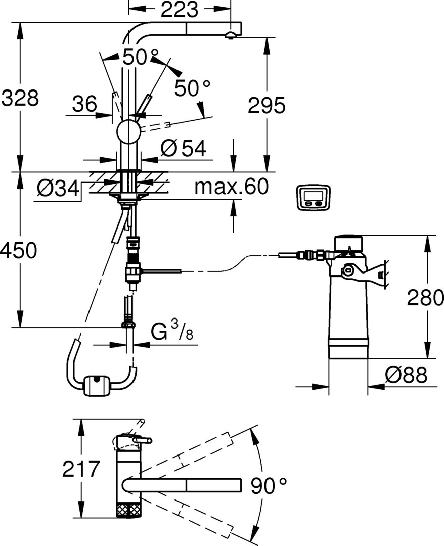 Filterfunktion, Einlochmontage, separater Griff für gefiltertes Wasser, Oberteil 1/2", StarLight Oberfläche, SilkMove 46 mm Keramikkartusche, schwenkbarer Rohrauslauf, Schwenkbereich 90°, getrennte Wasserführung für gefiltertes und ungefiltertes Wasser, flexible Anschlussschläuche, Blue Filterkopf, Blue Aktivkohlefilter, Kapazität 3000 l, Betriebsstundenzähler für den Filter mit 2x AA Batterien