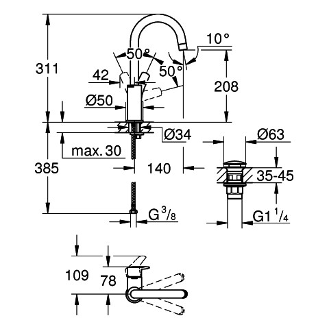 GROHE Waschtisch-Einhebelmischer Eurosmart 1/2", L-Size, glatter Körper, mit Push-Open-Ablaufgarnitur, schwenkbarer Rohrauslauf, chrom