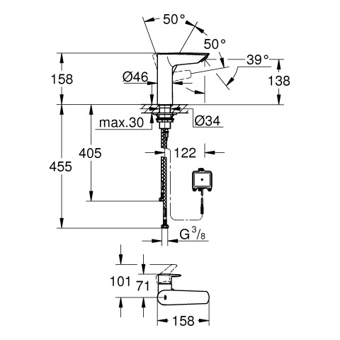 Aufbauhöhe Unterkante Hahnauslass 138 mm