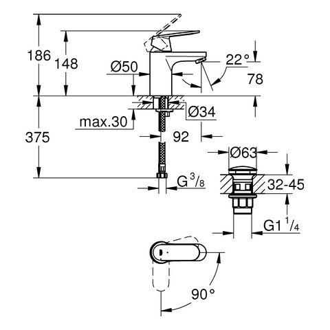 GROHE Waschtisch-Einhebelmischer Eurosmart Cosmopolitan 1/2", S-Size, glatter Körper, Push-open Ablaufgarnitur, Temperaturbegrenzer, Mittelstellung kalt, chrom